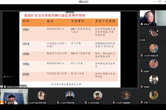 陈老师结合自己的教学实践和科研方向,从砷的自然存在与砷暴露,砷对人类健康的影响,砷的生物效应与作用机理等方面给同学们讲述了砷的化学生物学特性。讲述了砷在自然界的分布、转化与转移过程中,自然力量、人类活动、微生物、植物等因素的作用机制。从化学的底层逻辑出发,深入浅出地阐述了砷的高生物毒性与高生物活性、砷化物的致病与治病、毒药与医药,这些看似矛盾实际有着内在本质联系的问题。提高了同学们对学科交叉的认识,激发了同学们对各自专业的学习兴趣。增强了同学们在专业学习过程中运用辩证唯物主义世界观和方法论,一分为二看问题的自觉性。