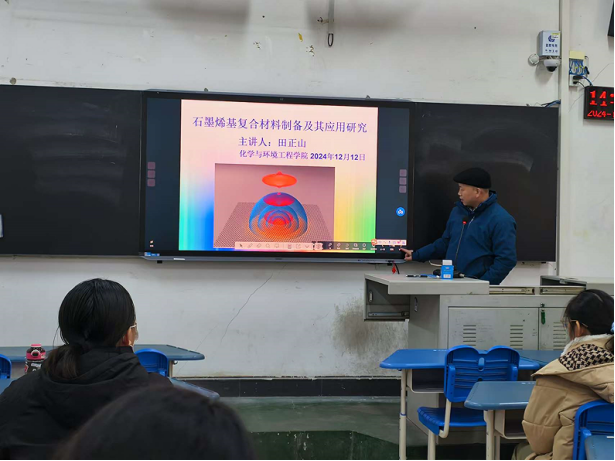 12月12日下午,威廉希尔WilliamHill官方网站田正山博士在4101教室为威廉希尔WilliamHill官方网站2024级化学1班同学作《石墨烯基复合材料制备及其应用研究》的学术报告。