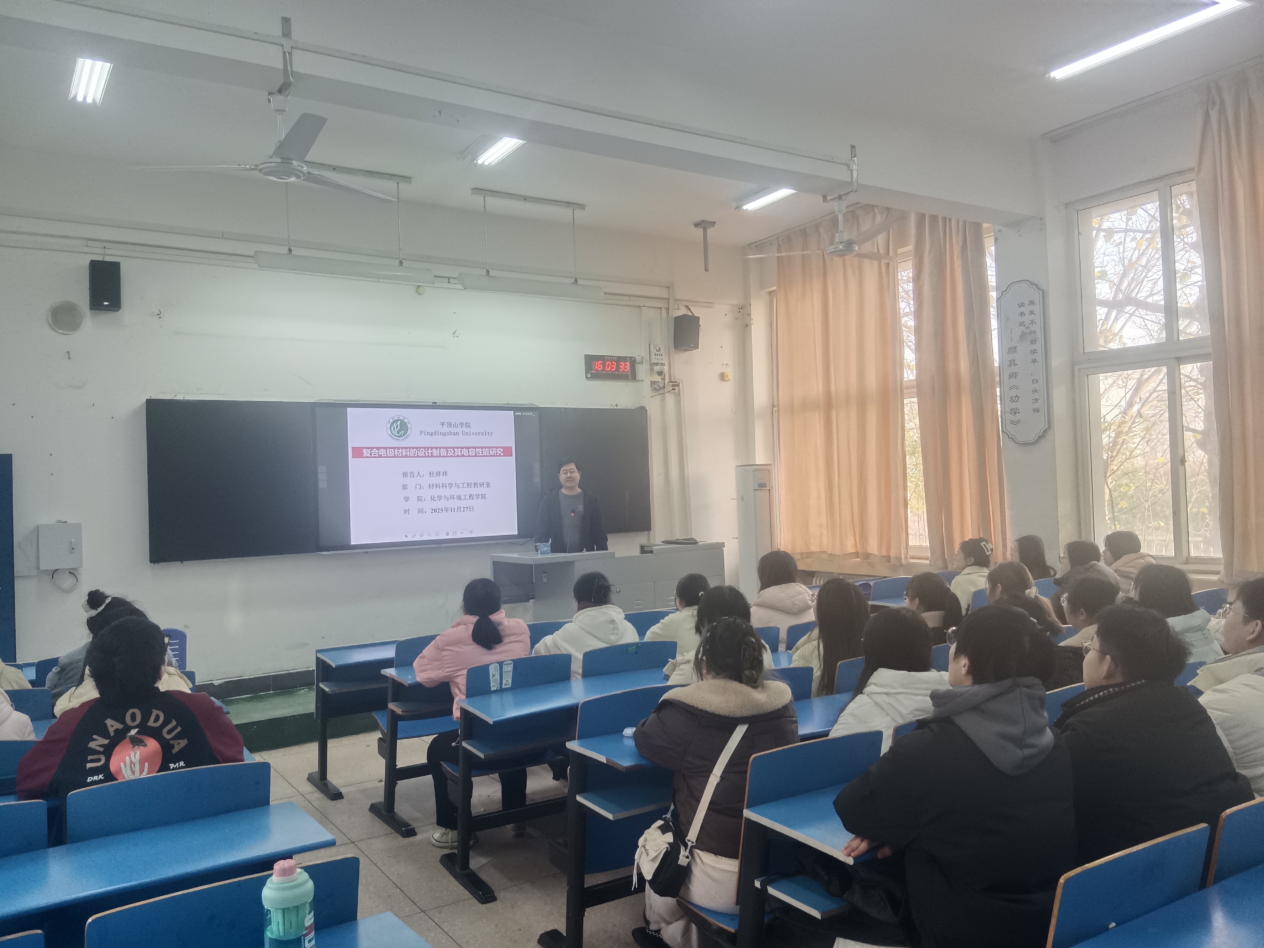2025年11月27日下午16时,威廉希尔WilliamHill官方网站杜祥祥博士在4号教学楼4104教室举办了学术讲座,报告题目为《复合电极材料的设计制备及其电容性能研究》,我院23级材料科学与工程专业的学生聆听了本次报告。