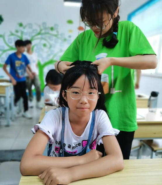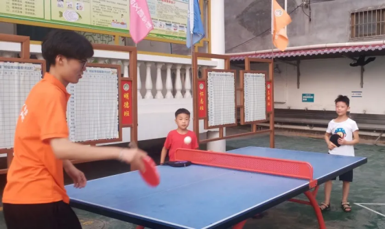 小朋友和志愿者老师第一次见面,起初他们还有点害羞,后来经过一番接触,和老师们逐渐熟悉起来,志愿者给小朋友扎辫子,和学生一起打乒乓球,不知不觉中拉近了彼此间的距离。