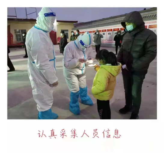 我的第二个志愿者工作是在村委会帮助做核酸信息采集、维护现场秩序。在采集信息之前,政府派专业人员对我们进行了培训,以便能够灵活熟练地使用信息采集软件,随后我们就开始了正式的工作。从1月9日至1月26日,我们进行了二十次核酸检测,而信息采集工作也并不像我想象中的容易。人都是有惰性的,特别是在寒冬,起床对我来说实在是件困难事。自从成为一名志愿者,我就一改往日睡懒觉的坏毛病,每天准时五点半起床去村委会开始一天的工作。为了避免任意穿脱造成防护服的浪费,我们的防护服常常一穿就是一天,而我们一天也只能吃一顿饭,睡六个小时。我们时刻准备着,为尽快战胜疫情不停地忙碌着。我们忍受着饥饿,忍耐着寒冷与疫情对抗,采集信息的时候手会冻到没有知觉,但是一想到有很多的医护工作者和我们站在同一战线,无论多冷,我们的心里也是暖暖的,全身也注入了持续奋斗的能量。
