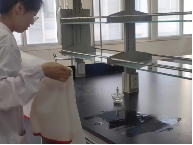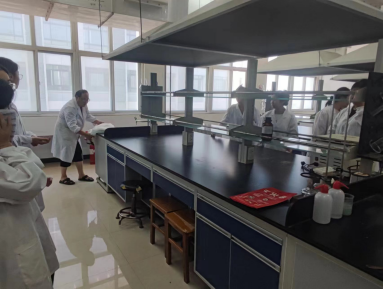 这次演练在化学楼320和322两个教学实验室同时举行,主要内容为危化品泄漏和酒精灯失火两个演练活动。演练前刘院长给师生们讲了这次演练的目的、流程及注意事项。危化品泄漏应急演练模拟某学生在实验过程中不小心将浓盐酸碰倒导致部分浓盐酸泄漏。实验老师马上组织学生有序撤离,打开通风设备,关上实验室房门,以防止污染气体向走廊扩散。2名救援人员穿上防护服,戴上防毒面罩、防护手套迅速进入现场,用吸水条将泄漏的盐酸围堵,用吸水纸吸取泄漏的盐酸,最后撒上碳酸氢钠。与此同时,救护组也在第一时间赶到现场,在安全区域检查相关人员是否有受伤,指导身上溅有化学品的同学,立即脱去污染的衣物,在紧急喷淋装置下用大量流动清水冲洗30分钟,再涂抹上弱碱性物质(如碱水、肥皂水等),必要时就医。