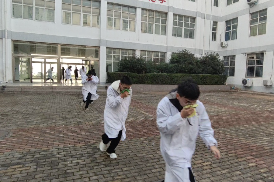 紧随其后的是火灾逃生疏散演练。化学楼内模拟响起火灾警报,浓烟弥漫。在实验室老师及安全员的引导下,楼内师生迅速反应,用湿毛巾捂住口鼻,弯腰低姿,沿着预定的紧急疏散路线,快速、有序地撤离至指定的安全集结地点。各楼层负责人清点人数,确保无一人滞留。演练过程组织周密,疏散路线明确,人员行动迅速,达到了预期效果。