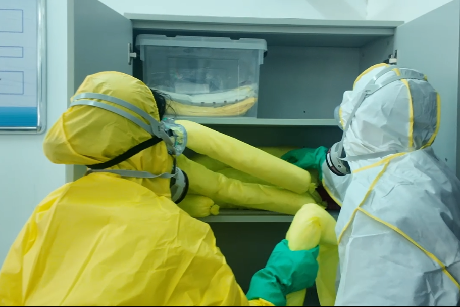 首先进行的是危险化学品泄漏应急演练。模拟场景为实验室内浓盐酸发生意外泄漏。事故一经“发现”,现场人员立即按照应急预案程序上报,并迅速启动应急响应。应急处置小组身着专业防护服,携带吸附棉、中和剂等器材迅速抵达现场,划定警戒区域,规范操作,对泄漏物进行快速、有效的控制与清理。整个过程紧张有序,各环节衔接紧密,充分展示了学院对危化品突发事件的规范处置流程和高效应对能力。
