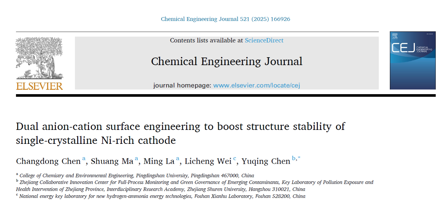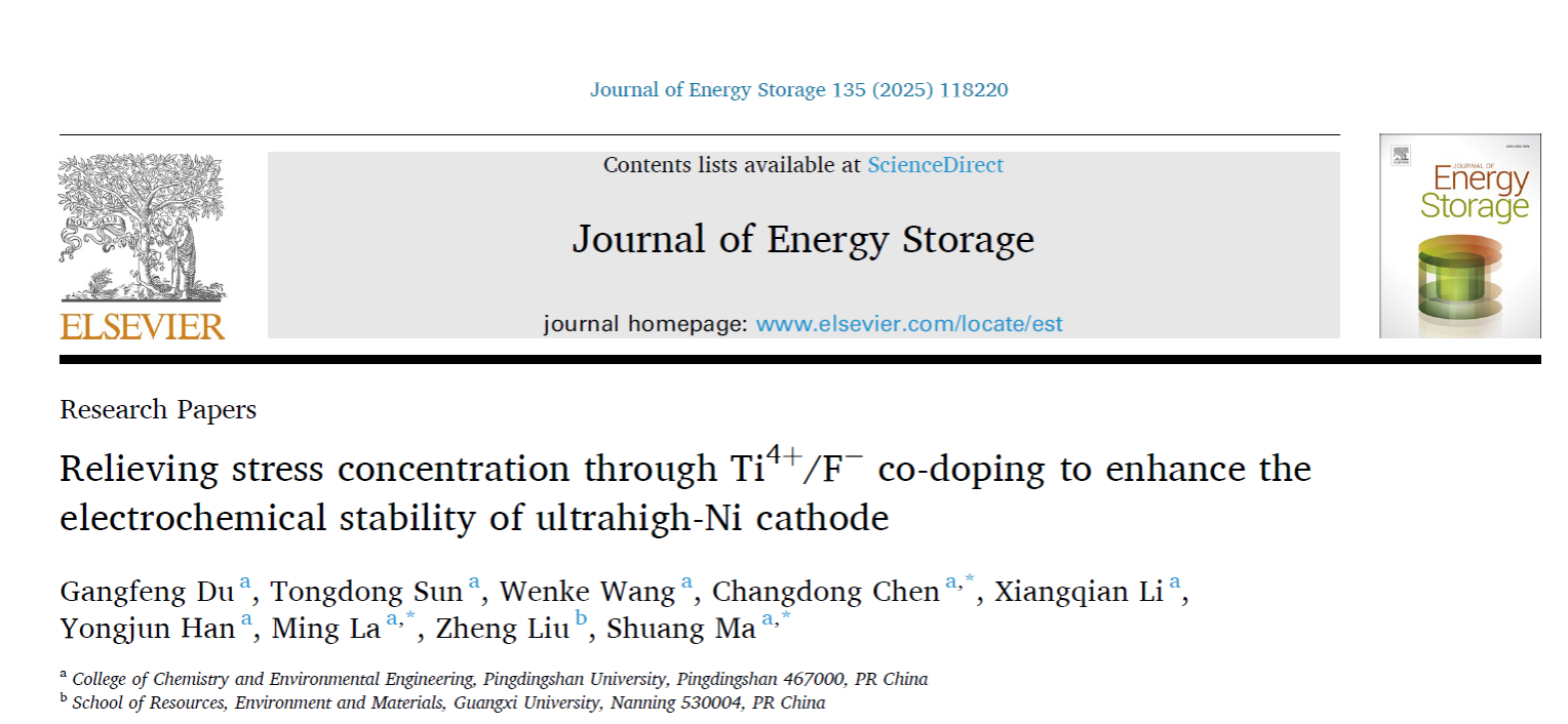 近期,威廉希尔WilliamHill官方网站纳米储能材料团队在能源材料领域取得系列重要进展。团队聚焦国家“双碳”战略,围绕高镍单晶电化学储能过程中的重要科学问题进行前沿性探索工作。相关研究成果以平顶山学院为第一署名单位发在《Chemical Engineering Journal》(中科院1区,TOP期刊,影响因子13.2)和《Journal of Energy Storage》(TOP期刊,影响因子9.8)上,陈昌东博士指导的材料与化工专业2025级硕士研究生王文科也参与该项工作中,展现出我校在学生的科研素养和创新能力培养上取得了突出成效。